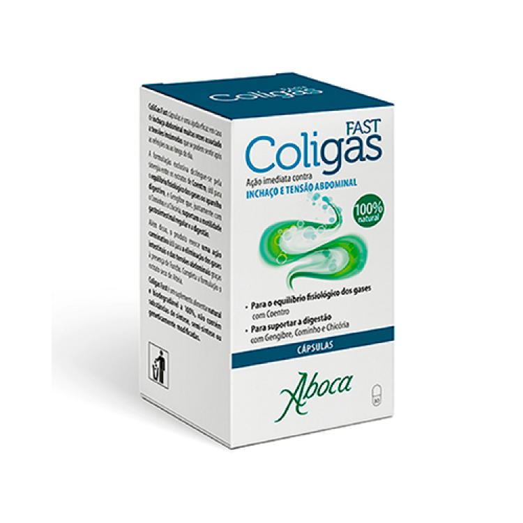ColiGas Fast cápsulas é uma ajuda eficaz em caso de inchaço abdominal muitas vezes associado a tensões incómodas que se podem sentir após as refeições ou ao longo do dia. A formulação exclusiva distingue-se pela sinergia entre os extratos de Coentro, útil para o equilíbrio fisiológico dos gases no aparelho digestivo, e Gengibre que, juntamente com o Cominho e a Chicória, suportam a motilidade gastrointestinal regular e a digestão. Além disso, o produto exerce uma ação carminativa útil para a eliminação dos gases intestinais e das tensões abdominais graças à presença de Funcho. Completa a formulação o extrato seco de Alteia. Posologia: Recomenda-se a toma de 1 ou 2 cápsulas 2 vezes por dia meia hora antes das refeições principais. O produto pode ser utilizado também em caso de necessidade, tomando 2 cápsulas até um máximo de 3 vezes ao longo do dia.