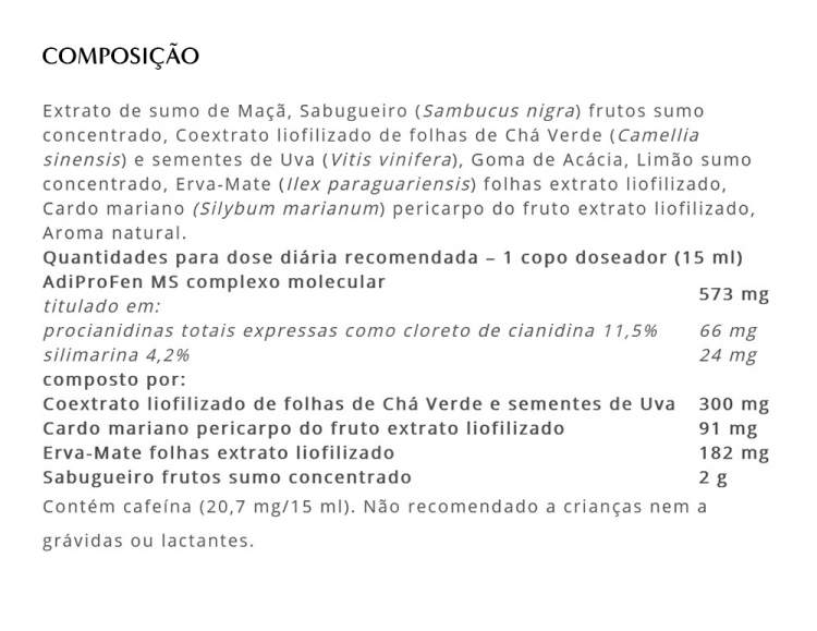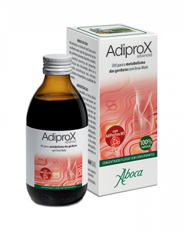 Adiprox Advanced, graças ao extrato liofilizado de Erva-Mate, desenvolve uma ação específica sobre o metabolismo das gorduras, contribuindo para a sua degradação, e ajuda a sentir-se com mais energia. A sua formulação, baseada num complexo molecular inovador rico em procianidinas, ácidos clorogénicos, flavonolignanos e flavanóis, foi enriquecida com o extrato liofilizado de Chá Verde, com propriedades antioxidantes benéficas, potenciadas pelas propriedades das Sementes de Uva, que oferecem uma defesa contra os radicais livres. Além disso, o extrato de Sementes de Uva auxilia a circulação venosa e o extrato de Cardo Mariano é útil para a funcionalidade do fígado, órgão dedicado também à gestão das gorduras no organismo. Posologia: tomar um copo doseador (15 ml) puro ou diluído num copo de água uma vez ao dia, preferencialmente durante a manhã.