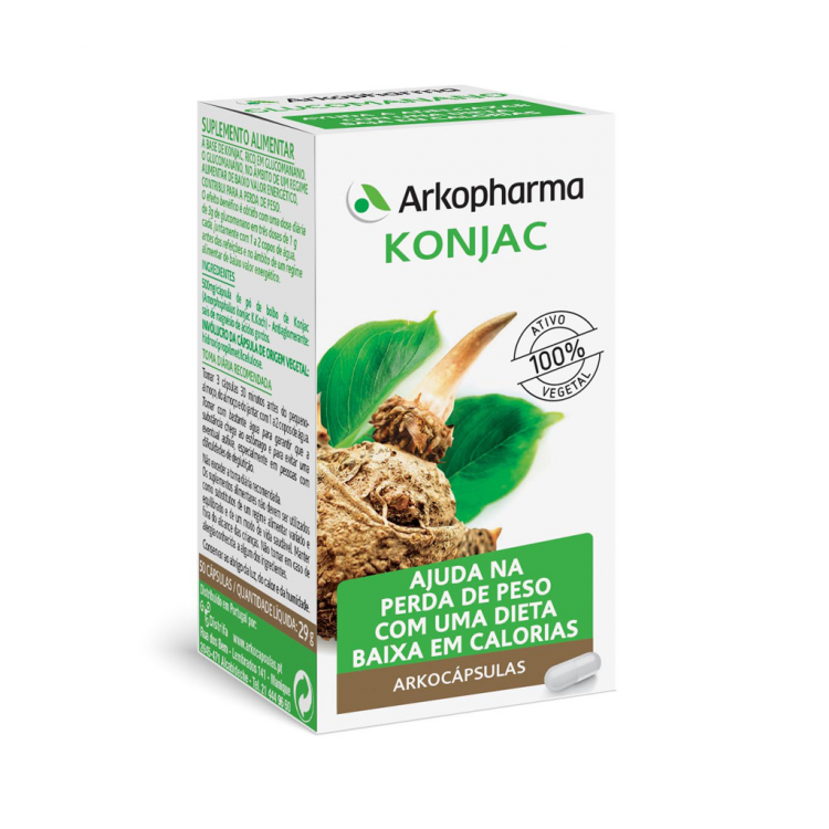[PESO CORPORAL, ELIMINAÇÃO LÍQUIDOS] Suplemento alimentar à base de Konjac, rico em Glucomanano que contribui para a perda de peso. O efeito benéfico é obtido com uma dose diária de 3g de glucomanano em três doses de 1g cada, juntamanete com 1 a 2 copos de água, antes das refeições e no âmbito de um regime alimentar de baixo valor energético. Cada cápsula contém 500mg de bolbo de Konjac (Amorphophallus konjac K. Koch) em pó. Tomar 3 cápsulas 30 minutos antes do pequeno almoço, do almoço e do jantar, com 1 a 2 copos de água. Deve-se tomar com bastante água para garantir que a substância chega ao estômago e para evitar uma eventual asfixia Tomar 3 cápsulas 30 minutos antes do pequeno almoço, do almoço e do jantar, com 1 a 2 copos de água. Tomar com bastante água para garantir que a substância chega ao estômago e para evitar uma eventual asfixia, especialmente em pessoas com dificuldades de deglutição. Dar pelo menos 2 horas de intervalo entre a toma deste suplemento e a toma de outros medicamentos por via oral.