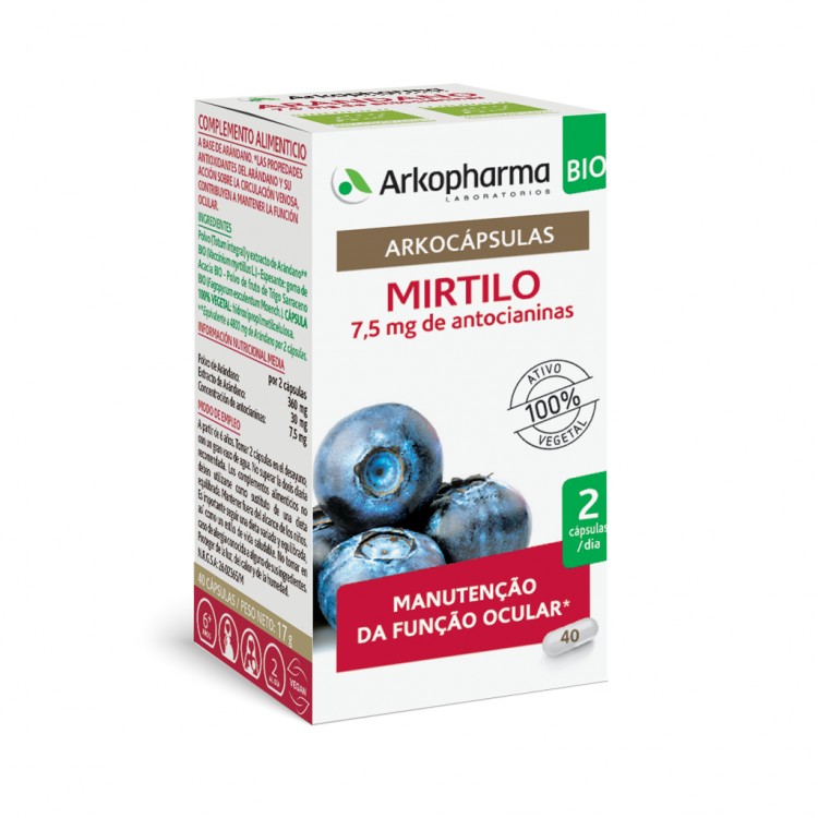 [BEM-ESTAR E CIRCULAÇÃO] Suplemento alimentar à base de Mirtilo rico em antioxidantes e cuja ação sobre a circulação venosa contribui para a manutenção da função ocular. Cada cápsula contém 380mg de pó integral criotriturado de Mirtilo (Vaccinium myrtillus L.) com um teor mínimo de 0,5% de taninos (expressos em pirogalol). Tomar 3 cápsulas por dia, às refeições, com um copo de água. Caso seja necessário, pode aumentar a toma para 5 cápsulas por dia.