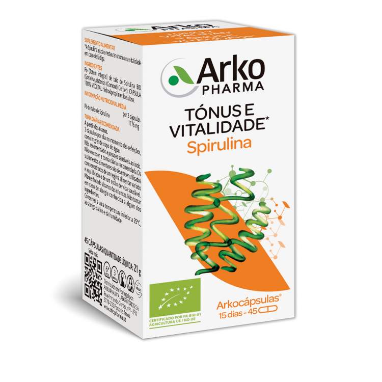 [FADIGA E ENERGIA] Suplemento alimentar Bio à base de Spirulina de agricultura biológica, que ajuda em caso de fadiga e contribui para a manutenção da vitalidade. Cada cápsula contém 392mg de Talo de Spirulina BIO pulverizado (Spirulina platensis (Gomont) Geitler). Tomar 3 cápsulas por dia no momento das refeições, com um copo de água.