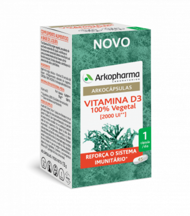 [ARTICULAÇÕES, OSSOS E DEFESAS] Suplemento alimentar à base de Líquen, fonte de Vitamina D3, para o normal funcionamento do sistema imunitário, bem como para a manutenção dos ossos e da função muscular. Em doses elevadas, contribui para a absorção de cálcio e fósforo. Adequado a partir dos 12 anos. Tomar 1 cápsula por dia.