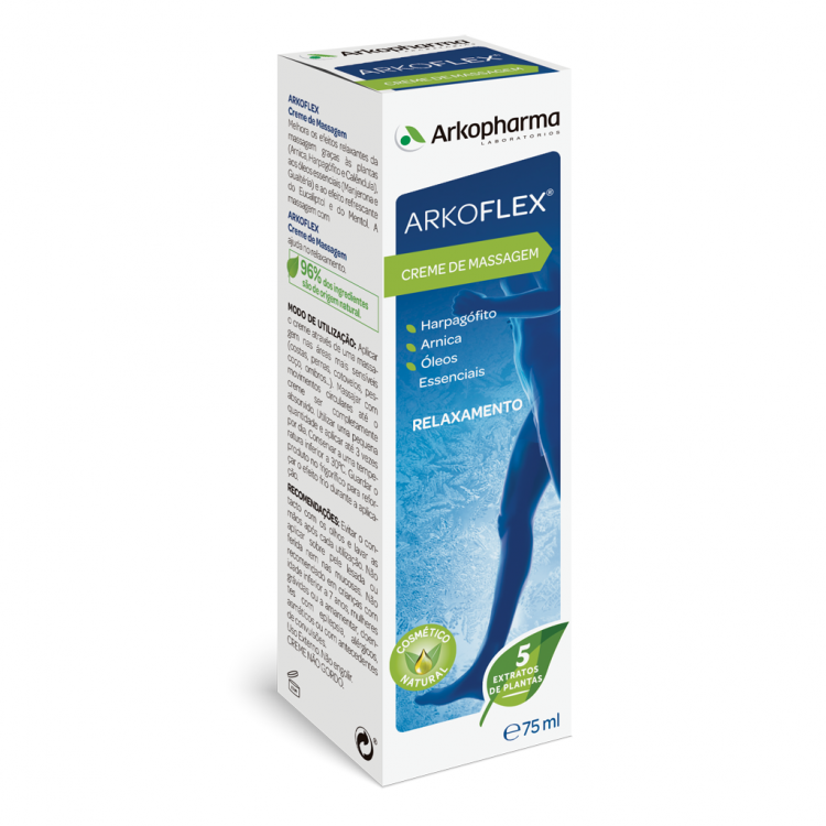[ARTICULAÇÕES, OSSOS E BEM-ESTAR] Arkoflex Creme de Massagem é um cosmético natural, que melhora os efeitos relaxantes da massagem graças às plantas Arnica, Harpagófito e Calêndula, aos óleos essenciais Manjerona e Gualtéria e ao efeito refrescante do Eucaliptol e do Mentol. Textura não gordurosa, que ajuda no relaxamento.