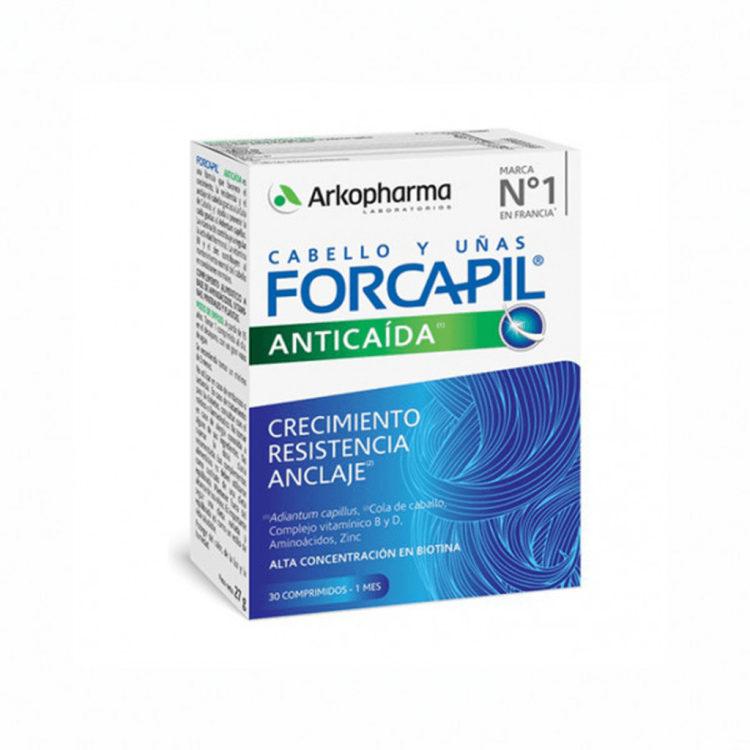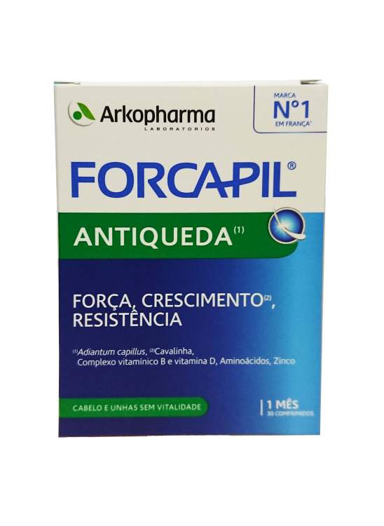 Arkopharma Forcapil Antiqueda - suplemento alimentar à base de aminoácidos, vitaminas, minerais e plantas. Forcapil, especialista na saúde do cabelo há mais de 30 anos, desenvolveu Forcapil Antiqueda, especialmente formulado para ajudar a fortalecer a fibra capilar e aumentar a sua resistência, diminuir a queda de cabelo graças ao Adiantum capillus, promover o crescimento e a vitalidade graças à cavalinha e manter o cabelo em condições normais graças à vitamina B8 (biotina). Contém extrato da parte aérea da Avenca, pó criotriturado da cavalinha, L-cistina, L-arginina, vitaminas D3, B5, B6, B8 e B9, zinco e cobre.