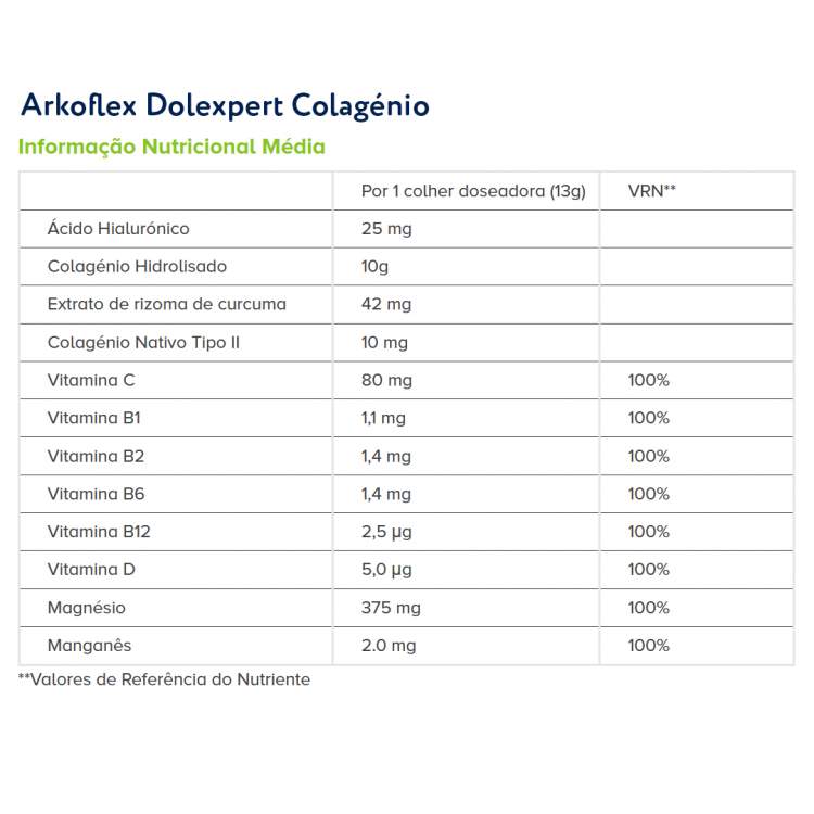 [ARTICULAÇÕES E OSSOS] Suplemento alimentar em pó à base de Colagénio hidrolisado e tipo II nativo, Ácido hialurónico, Magnésio, Manganês, Curcuma e Vitamina C, B1 (Tiamina), B2 (riboflavina), B6, B12 e D, uma associação única e inovadora de ingredientes para ajudar à mobilidade e à nutrição dos ossos, cartilagem e músculos. A Curcuma contribui para a flexibilidade articular. A Vitamina C ajuda na normal formação do colagénio e contribui para o normal funcionamento dos ossos, das cartilagens e da pele. O Magnésio ajuda no normal funcionamento dos músculos. Posologia (reservado ao adulto): 1 colher doseadora por dia (13g), diluída de preferência num grande copo de água ou sumo, à temperatura ambiente.