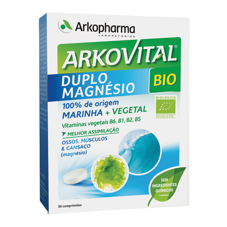 [ARTICULAÇÕES, OSSOS, FADIGA E ENERGIA] Arkovital Duplo Magnésio é um suplemento alimentar à base de alface do mar e de um concentrado de extratos vegetais. Apresenta uma associação exclusiva de Magnésio de origem marinha e vegetal, proveniente da alface do mar. O Magnésio contribui para a manutenção de ossos normais e para o normal funcionamento do sistema nervoso e muscular. O Magnésio e a Vitamina B6 contribuem para a redução do cansaço e da fadiga. Os extratos vegetais fornecem vitaminas do complexo B, de origem 100% vegetal com uma absorção otimizada. POSOLOGIA: - Adultos e crianças a partir dos 6 anos: Tomar 1 comprimido por dia ao pequeno-almoço, com um grande copo de água. - Adultos com níveis de carência mais elevados: Tomar 2 comprimidos por dia (1 de manhã e outro à noite).