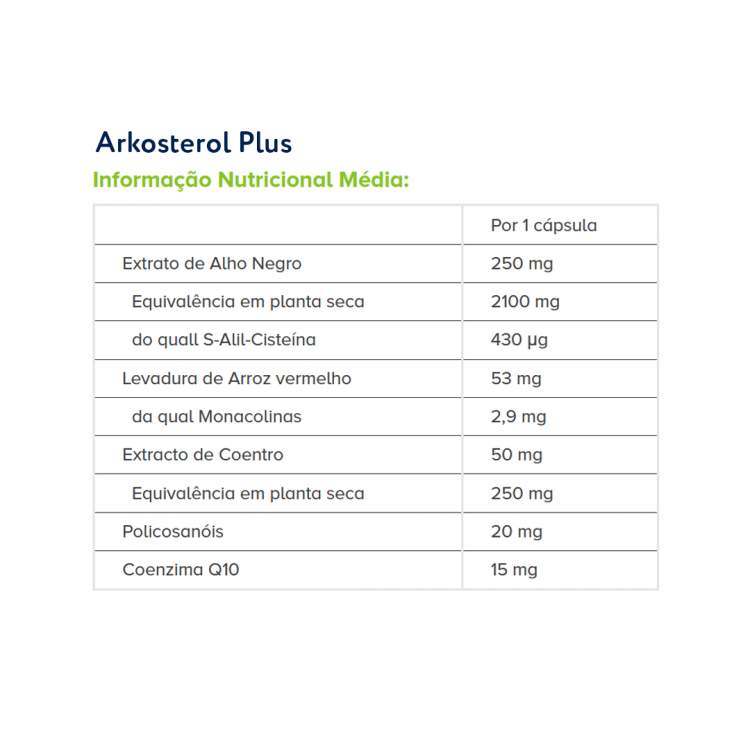 [METABOLISMO] Suplemento alimentar à base de Policosanóis, Coenzima Q10, Levedura de arroz vermelho e extratos de Alho negro e Coentro. O Alho negro e o Coentro contribuem para a manutenção de níveis normais de colesterol e para o bem-estar cardiovascular. Não tomar em associação a outros produtos com levedura de arroz vermelho ou medicamentos para a redução do colesterol. A toma diária não deve superar os 3mg de monacolinas. Tomar 1 cápsula ao jantar, com um copo de água.