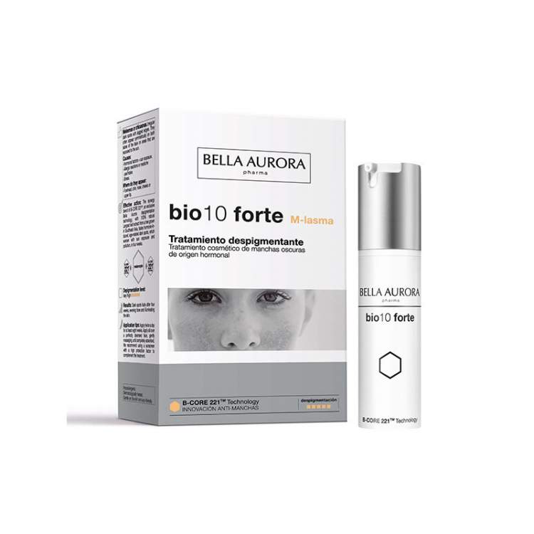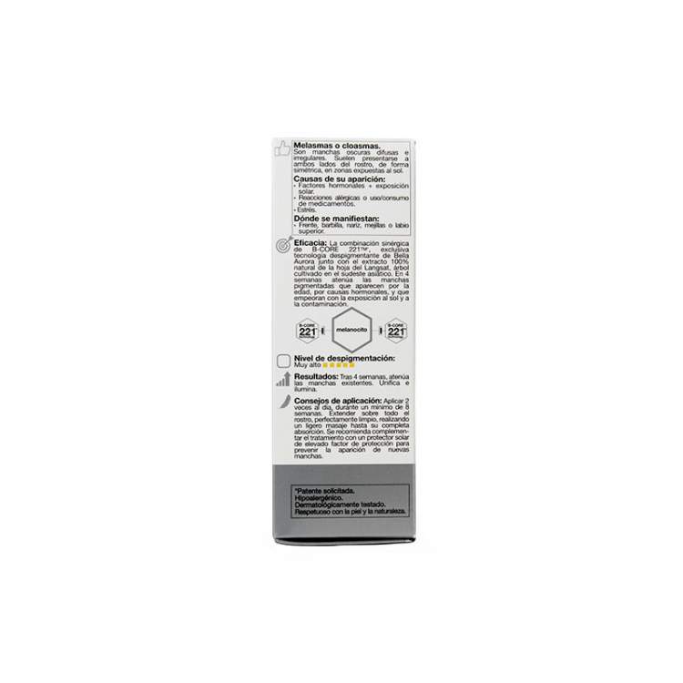 Tratamento intensivo para manchas de origem hormonal. Uma combinação de princípios ativos com a exclusiva tecnologia despigmentante B-CORE221™. Um sistema de encapsulação e libertação dirigida que permite atuar diretamente sobre as células produtoras de melanina, libertando aí, de forma precisa e integral, o seu princípio ativo despigmentante, para obter assim a máxima eficácia. Como são as manchas de origem hormonal? Manchas escuras difusas e irregulares. Costumam aparecer de ambos os lados do rosto, simetricamente, em áreas expostas ao sol (testa, queixo, nariz, bochechas ou lábio superior). A causa do seu aparecimento é a exposição solar, geralmente potenciada por fatores hormonais, pelo stress, por reações alérgicas ou pelo consumo de medicamentos. Hipoalergénico. Testado sob controlo dermatológico.