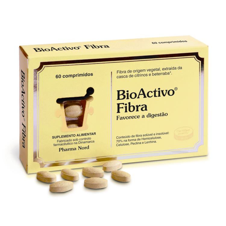 Suplemento alimentar uma mistura equilibrada de fibras vegetais naturais, solúveis e insolúveis, derivadas da casca do limão e da beterraba que compensam o baixo teor de fibra das dietas modernas. BioActivo Fibra é benéfico para o sistema digestivo, ajudando o organismo a eliminar resíduos, ao mesmo tempo que contribui para o intestino se esvaziar regular e eficazmente. É fácil de engolir e possui um grande conteúdo de fibras: 70% de fibras alimentares. Contém, em 2 comprimidos, 1312 mg de fibras vegetais, das quais 920mg são fibras alimentares. Posologia: Adultos: 2 comprimidos por dia, ou segundo a indicação do médico. Engolir os comprimidos inteiros, à refeição, sempre acompanhados de um grande copo de água. Crianças (4-12 anos): 2 comprimidos por dia. Fabricado sob controlo farmacêutico na Dinamarca.