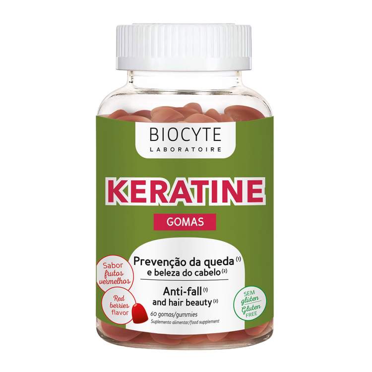Suplemento alimentar à base de queratina, para prevenção da queda e fortalecimento capilar. Ajuda a reforçar a estrutura do fio, para que o cabelo se mantenha saudável, com mais volume, brilho e mais forte. Contribui ainda para ativar a circulação sanguínea do couro cabeludo, protege as células do stress oxidativo e purifica o escalpe. Indicado para cabelos fracos, quebradiços, baços, sem vida e com queda. Contém queratina hidrolisada, Avenca, Biotina, Zinco e Selénio. Fórmula com gelatina vegetal. Tomar 2 gomas por dia, durante 3 meses no mínimo. Guardar num local seco, abaixo dos 25º e protegido da luz solar.