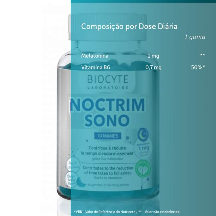 Suplemento alimentar á base de melatonina e vitamina B6 para ajudar a reduzir o tempo para adormecer. A sua fórmula não causa habituação nem sonolência durante o dia, respeita o ciclo circadiano, contribui para o normal funcionamento do sistema nervoso e o seu formato em gomas permite uma toma rápida, em qualquer lugar, sem necessidade de água. Contém 1mg de Melatonina e 0,7mg de Vitamina B6. Gomas fabricadas com gelatina vegetal. Tomar 1 goma, por dia, 30 minutos antes de se deitar. Guardar num local seco, abaixo dos 25º e protegido da luz solar.
