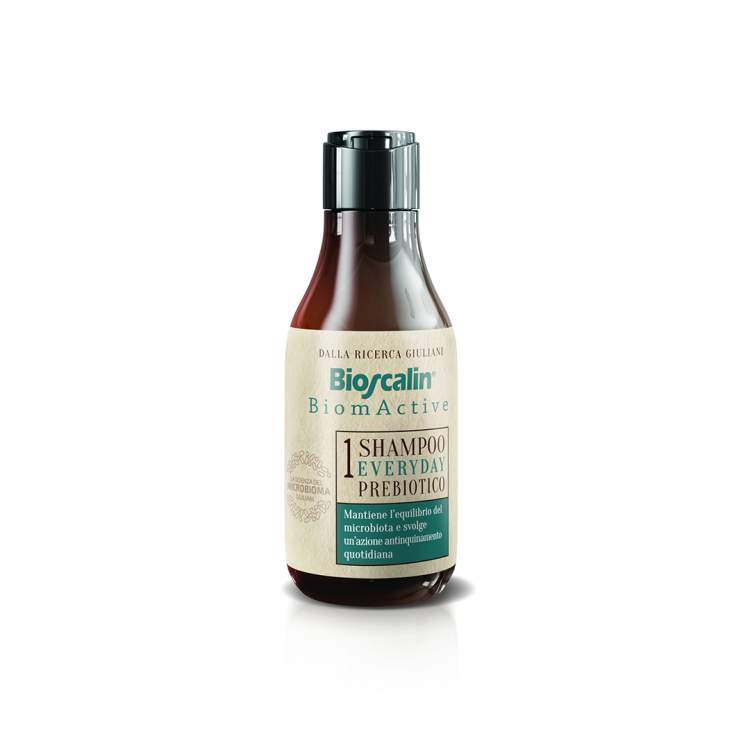 Champô prebiótico equilibrante, que mantém o equilíbrio do microbioma e aumenta as defesas naturais do couro cabeludo e do cabelo. O stress, poluição, desidratação, raios UV/IV, fumo e medicação são alguns dos elementos que conduzem a uma alteração do microbioma do couro cabeludo, provocando numerosos problemas, tais como: vermelhidão, prurido, produção excessiva de sebo, cabelos sem vida, frágeis e ao aparecimento da caspa. Bioscalin BiomActive é o primeiro champô probiótico e prebiótico que o ajuda a manter o equilíbrio do couro cabeludo graças à associação de 3 ingredientes chave naturais: a Bioecolia (prebiótico), o Ácido Láctico (posbiótico) e o Lactobacillus rhamnosus T12 (probiótico patenteado pela Giuliani). Estes componentes ajudam a equilibrar o microbioma, restaurar o nível ideal de pH da pele e potenciar o equilíbrio no microbioma, promovendo o mecanismo fisiológico de autodefesa contra agressões externas. A sua fórmula contém ainda: Ormesia, com Passiflora, para proteger o cabelo e couro cabeludo através do aumento das defesas naturais; o complexo Defensil Plus, com ingredientes ativos como Óleo de Semente de Groselha Negra, Óleo de Semente de Girassol insaponificáveis, Extrato de flor / folha / videira, tocoferol, para reduzir a irritação, ajudar a restaurar a função de barreira da pele e ação seboreguladora. Possui também uma ação antioxidante devido à Couperina e uma ação de limpeza suave pois utiliza tensioactivos ultra delicados de elevada tolerabilidade. Champô com com pH fisiológico, sem sulfatos, sem silicones e sem corantes, dermatologicamente testado. Níquel testado.