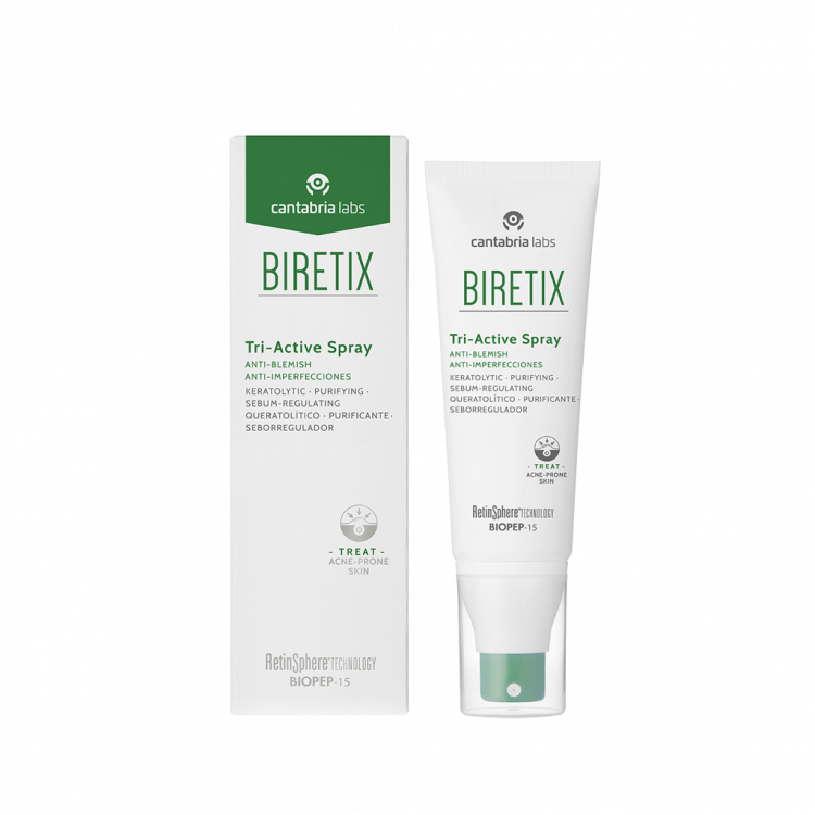 Cuidado intensivo em formato spray, para uma rápida e fácil aplicação em zonas extensas do corpo como peito e costas. Invisível, de secagem rápida, a sua fórmula foi desenhada para produzir as atividades queratolítica, purificante e seboreguladora, necessárias para melhorar as condições da pele com tendência acneica. À tecnologia exclusiva e inovadora RetinSphere®, que estimula a renovação celular e promove a eliminação suave das células mortas da superfície cutânea, foi adicionado o Ácido Glicólico que, graças ao seu efeito renovador, previne a obstrução dos poros e a formação de imperfeições, tornando a pele mais hidratada, sedosa e matificada. A Niacinamida, ajuda a regular os níveis faciais de sebo, melhorando a textura e homogeneizando o tom da pele, e simultaneamente diminuindo as imperfeições resultantes das lesões acneicas (hiperpigmentações e máculas avermelhadas). O inovador péptido BIOPEP-15 abranda a proliferação dos agentes agravantes das lesões.