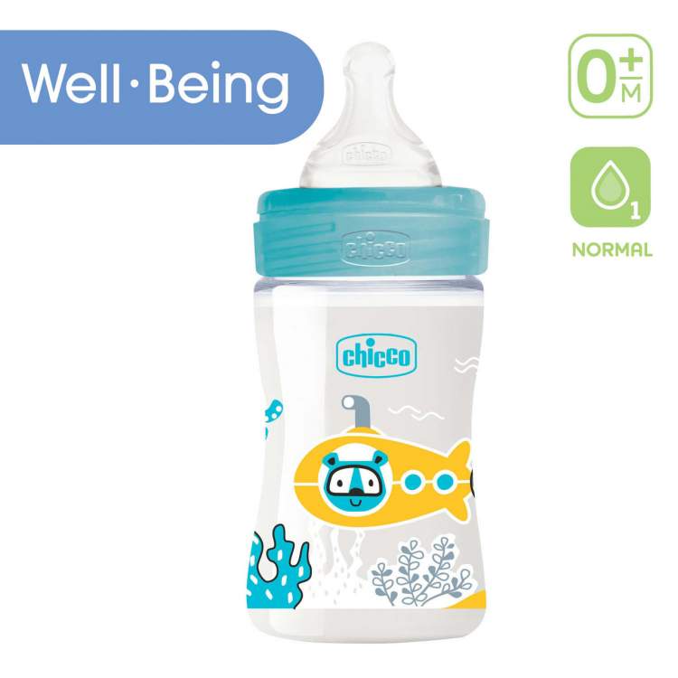 Os biberões Well-Being foram pensados para simplificar a vida dos pais. O biberão Well Being Chicco 0m+ 150ml fluxo normal é a escolha perfeita para alimentação diária do bebé. A tetina Physio é fabricada em silicone macio “Efeito Mamã” – transparente e higiénico, não absorve sabores nem odores, e não deforma com o tempo, mesmo após várias esterilizações. Garante uma alimentação calma e natural graças ao acabamento Soft Sense e à base larga, específica para a boca e lábios pequenos do bebé. Facilita o movimento natural de sucção, o fecho correto da boca e a movimentação peristáltica regular da língua graças ao seu formato especial plano, simétrico e alongado. Facilita a transição do peito para o biberão e vice-versa. Os anéis em relevo oferecem uma sensação natural durante a amamentação. As tetinas estão disponíveis em quatro versões que se adaptam às diferentes fases de crescimento (Normal, Médio, Rápido e Papa). Compatíveis com todos os biberões Well-Being. A válvula anticólicas presente no biberão foi desenvolvida para prevenir a ingestão de ar, ajudando a reduzir a irritabilidade, regurgitação e as cólicas após o aleitamento. Biberão prático e ergonómico para os pais, com larga abertura superior para encher o biberão rapidamente e facilitar a limpeza. Encaixe seguro, antifugas, para a máxima proteção e higiene. Fabricado em plástico polipropileno de alta qualidade, 0% BPA.