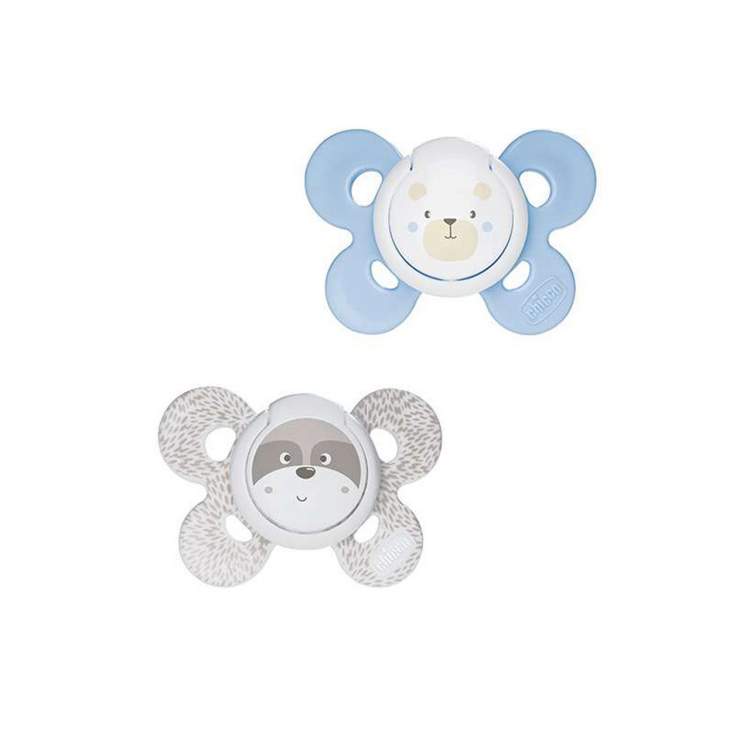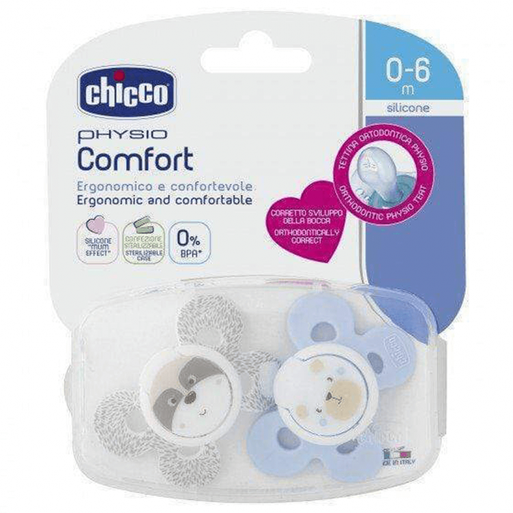 As chupetas PhysioForma Comfort são ergonómicas e confortáveis. Assegura o máximo de espaço para o queixo e nariz, facilitando a respiração e os movimentos de sucção. Com apenas 4 superfícies de contacto garantem a máxima liberdade e suavidade sobre a pele do bebé. Suave e em silicone higiénico, sem sabor ou odor e que não deforma com o tempo, a tetina favorece o correto desenvolvimento da boca do bebé e o posicionamento natural da língua. A área existente na base da tetina é grande e espaçosa, garantindo o espaço suficiente para que os lábios do bebé se possam movimentar naturalmente durante a sucção. Disponível em 3 tamanhos diferentes: 0-6m, 6-16m e 16-36m, para assegurar o tamanho correto da chupeta em cada fase do crescimento. Com anel de segurança. Contém caixa de esterilização que permite higienizar as chupetas Chicco no micro-ondas, matando 99,9% dos germes domésticos nocivos em apenas 3 minutos! Basta seguir os próximos passos: Passo 1: Encha a caixa com água até a linha de nível, coloque as chupetas dentro da caixa e feche a tampa Passo 2: Coloque no micro-ondas por 3 minutos a 750 Watts. Espere até que todas as peças arrefeçam Além disso, permite guardar as chupetas quando não estão a ser utilizadas.