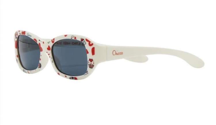 Embalagem com uns óculos de sol Chicco com caixa de armazenamento incluída.