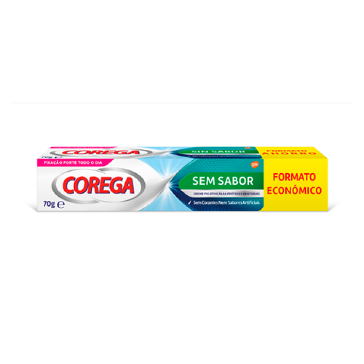 Corega Sem Sabor faz parte da gama de fixativos para próteses dentárias Corega Sem Sabor, não tem zinco nem corantes artificiais.