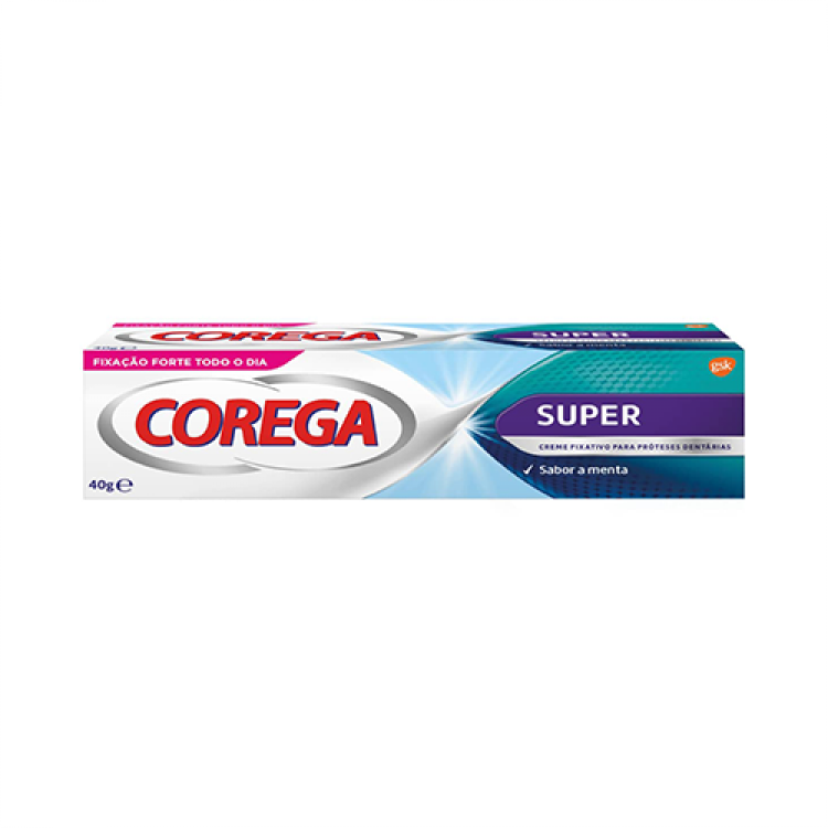 Corega Super é um creme fixativo que proporciona uma fixação forte da prótese no sentido vertical, horizontal e diagonal para que não se preocupe durante todo o dia. Fixação até 12 horas. O movimento da prótese vê-se reduzido para um ajuste perfeito. A primeira vez aplique uma pequena quantidade. Aplicar demasiado creme fixativo pode fazer com que o produto transborde da prótese. Podem ser necessárias várias tentativas até que encontre a quantidade correta. Aplique uma vez ao dia para uma fixação segura. Se necessitar de aplicar mais do que uma vez ao dia consulte o seu dentista.