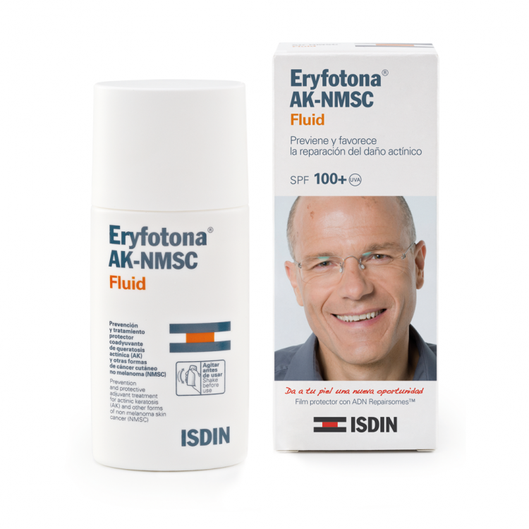 Eryfotona Fluid. Dê à sua pele uma nova oportunidade. Dispositivo Médico de classe IIA especialmente formulado para a queratose actínica (AK) e outras formas de cancro cutâneo não melanoma (NMSC) com 3 indicações: - Prevenção; - Tratamento coadjuvante; - Redução e melhoria do campo de cancerização subclínico. Previne e favorece a reparação do dano actínico provocado pelo sol. Cria um filme protetor com Repairsomes sobre a pele, que contém fotoliase encapsulada em lipossomas e filtros ultravioleta que absorvem, refletem e dispersam a radiação solar. Aplicar generosamente sobre toda a zona afetada e outras zonas de risco devido a exposição solar crónica (rosto, testa, orelhas, decote, couro cabeludo e dorso das mãos) duas vezes por dia, de manhã e ao meio-dia. Uso diário. A fotoliase é ativada pela luz visível. Em caso de exposição solar direta, reaplicar o produto a cada duas horas.