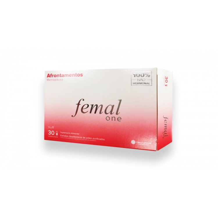 Femal One é um suplemento alimentar, que contém Extratos Citoplasmáticos de Pólen Purificado e Vitamina E, indicado para reduzir sintomas relacionados com a menopausa como o desconforto, afrontamentos ou o cansaço. Vencedor do Prémio 5 Estrelas, Femal One é um suplemento 100% NÃO HORMONAL, para mulheres que não possam ou não queiram fazer terapêutica hormonal. ” Os testes indicam um nível de satisfação superior a 80% especialmente pela diminuição dos afrontamentos, contribuindo para o conforto e bem-estar.” A sua formulação associa 3 ativos originais: PureCyTonin®Complex PI, obtido a partir de extratos de pólen germinados e de pólen-pistilo; PureCyTonin®Complex GC, obtido a partir de diversas variedades de extratos de pólen e Vitamina E que contribui para a proteção das células contra as oxidações indesejáveis. O pólen contribui para o conforto e bem-estar, ajudando a reduzir o desconforto e as ondas de calor durante a menopausa e aumenta ainda a resistência, melhorando a vitalidade. A produção é realizada a partir de um processo inovador e patenteado, que confere a este suplemento alimentar uma qualidade de excelência reconhecida pela marca: PureCyTonin®. Os extratos citoplásmicos de pólen purificados FEMAL ONE® – PureCyTonin®Complex PI e GC – foram estudados em vários estudos clínicos com mulheres. O processo de extração exclusivo utilizado no femal one permite obter um citoplasma purificado e eliminar os potenciais alergénios do pólen. Os alergénios nos extratos de pólen são vestigiais e podem ser considerados irrelevantes na toma diária indicada. Tomar cápsula de manhã ou à noite. Por ser um produto de origem natural, é fundamental que se tome este produto de modo contínuo, durante um período mínimo de dois meses.