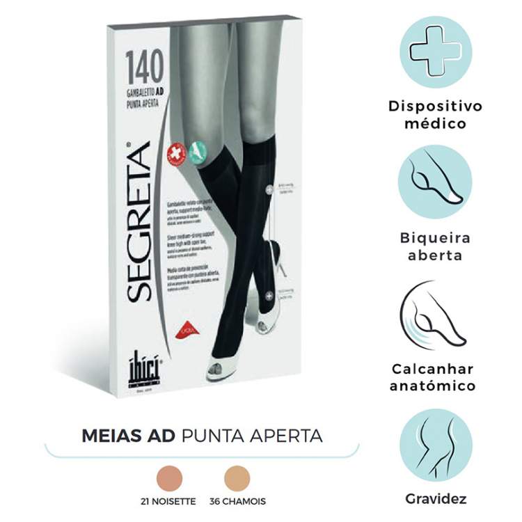 Meias de compressão até ao joelho em malha de rede e sem biqueira. Ajuda a aliviar as pernas cansadas e inchadas e tratar as primeiras manifestações da insuficiência venosa, inclusive durante a gravidez. Indicado para uso com calçado aberto à frente.