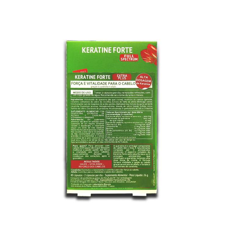 NOTA: PRODUTO COM VALIDADE CURTA (09/2025) Suplemento alimentar rico em queratina para cabelos enfraquecidos, sem força nem vitalidade. Ajuda a reforçar a saúde do seu cabelo e estimular o seu crescimento graças à queratina, extrato de alfafa, biotina e cavalinha. Tomar 2 cápsulas por dia, à hora da refeição. Recomenda-se uma toma mínima de 3 meses para obter os resultados pretendidos.