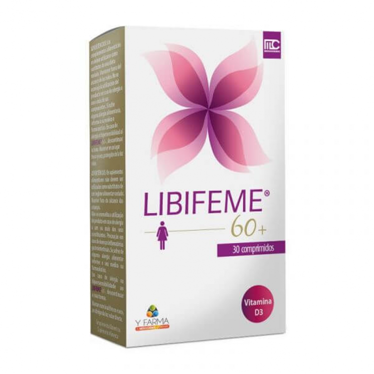 Especialmente desenvolvido para mulheres na pós-menopausa que têm desconforto íntimo crescente, devido à redução / falta de lubrificação vaginal na menopausa. Os comprimidos LIBIFEME 60+ encapsulam o conhecimento e o poder da fitoterapia tradicional (Asafoetida e Capparis). Sendo rico em nutrientes à base de plantas e vitaminas (Vitamina A, B2, B8, D3 e E), o LIBIFEME 60+ pode contribuir para o bem-estar geral das mulheres pós-menopáusicas. Tomar LIBIFEME pode: - Melhorar a hidratação da pele e das mucosas (olhos, boca, vagina); - Melhorar a lubrificação vaginal fisiológica; - Aumentar a sensibilidade na zona genital e a sensação de prazer; - Contribuir para a proteção das células contra o stress oxidativo. POSOLOGIA: Tome 1 comprimido por dia de manhã, durante 4 a 12 meses.