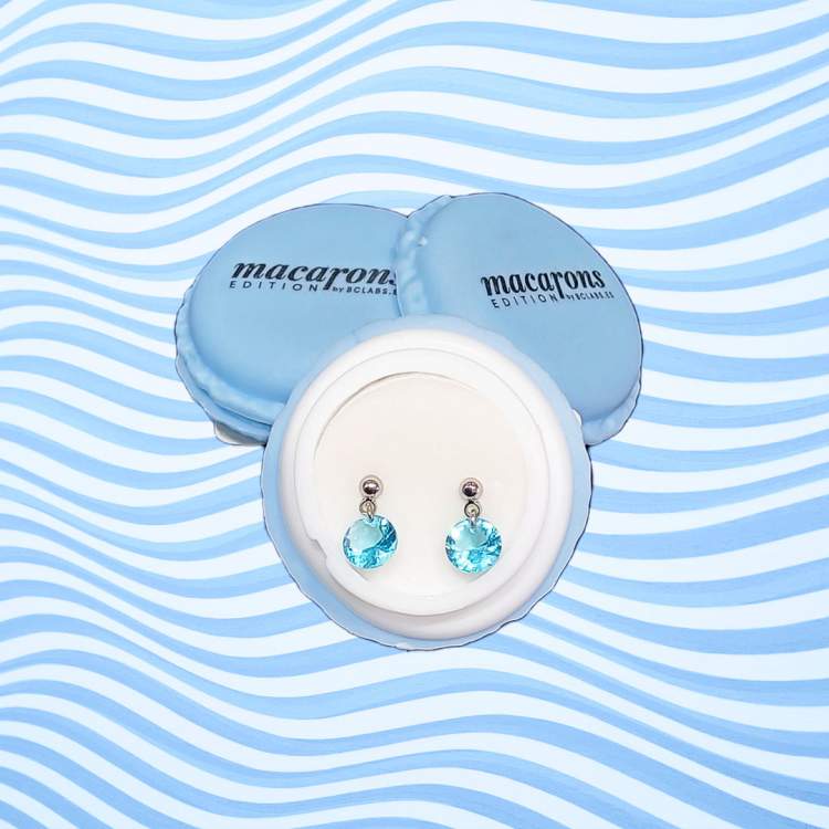 Caixa macaron com 1 par de brincos em metal prateado e com cristais azuis.