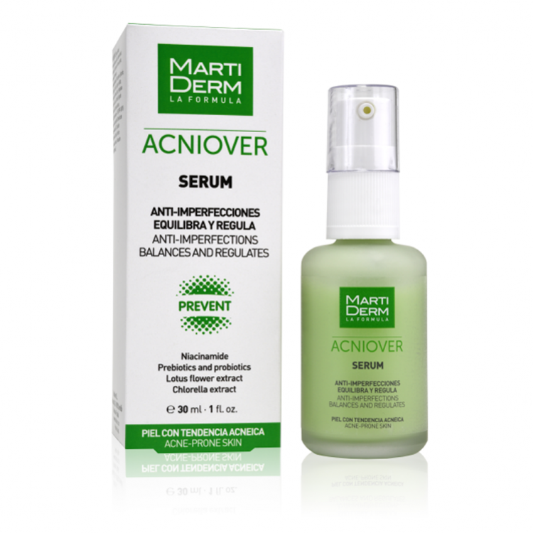 Sérum anti-imperfeições que equilibra a microbiota da pele e regula o seu pH, fornecendo um efeito seborregulador e uma pele sem imperfeições, graças à sua formulação com Niacinamida, Extrato de Flor de Lótus e Probióticos. Acniover Serum constitui, juntamente com Acniover Cápsulas, um dos 3 passos fundamentais da estratégia MartiDerm contra o acne: a prevenção. A sua textura sérum permite a rápida absorção dos ativos em concentrações eficazes para reduzir a quantidade de sebo, a vermelhidão e a prevenção do aparecimento de pontos negros.