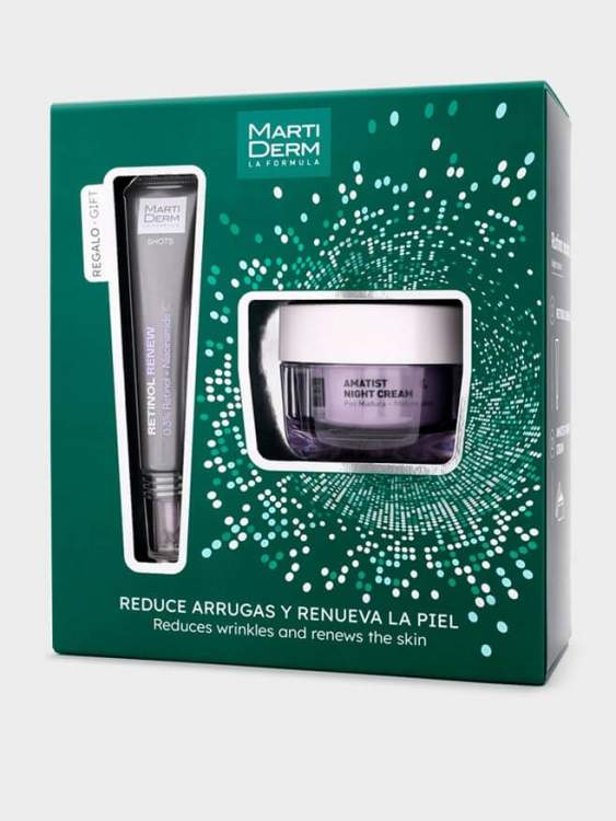 Embalagem com 1x MartiDerm Amatist Night Cream 50ml + MartiDerm Shots Retinol Renew 20ml (Oferta). Valor real estimado 63,45€.