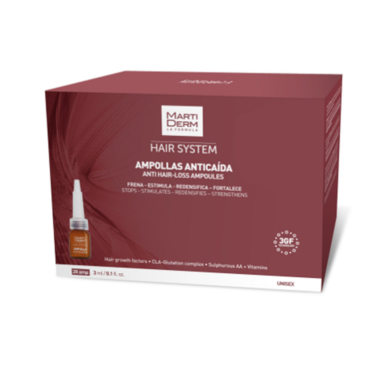 As Ampolas Antiqueda Hair System contêm fatores de crescimento capilar com que combatem os diferentes tipos de queda do cabelo (alopecia androgenética e eflúvio telógeno). Ajudam a travar o processo de queda e estimulam o crescimento de novos cabelos, aumentam a densidade e melhoram a fixação ao couro cabeludo, graças aos seus três fatores de crescimento, biotinil, ácido oleanólico, apigenina e um complexo vitamínico, entre outros ingredientes. O cabelo volta a recuperar a sua força e densidade. Aplicar diariamente: Oxigenar o couro cabeludo com uma escovagem de 2 minutos, aplicar o conteúdo de 1 ampola na zona afetada e massajar a zona até ser absorvido.