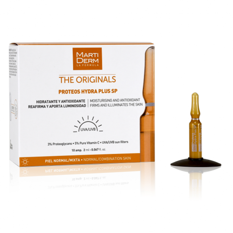 A versão das ampolas Proteos Hydra Plus com proteção solar! Atuam desde a primeira aplicação, hidratando e conferindo luminosidade e suavidade à pele. Além disso, o seu uso diário previne e corrige as rugas e aumenta a firmeza da pele. A sua fórmula encontra-se enriquecida com proteoglicanos e Vitamina C, que proporcionam uma hidratação intensiva, luminosidade, poder antioxidante e elasticidade cutânea. Agitar a ampola, abrir com o sistema "easy open", colocar a ponta doseadora, verter metade do conteúdo na mão e aplicar. Conserve o restante para a próxima aplicação.