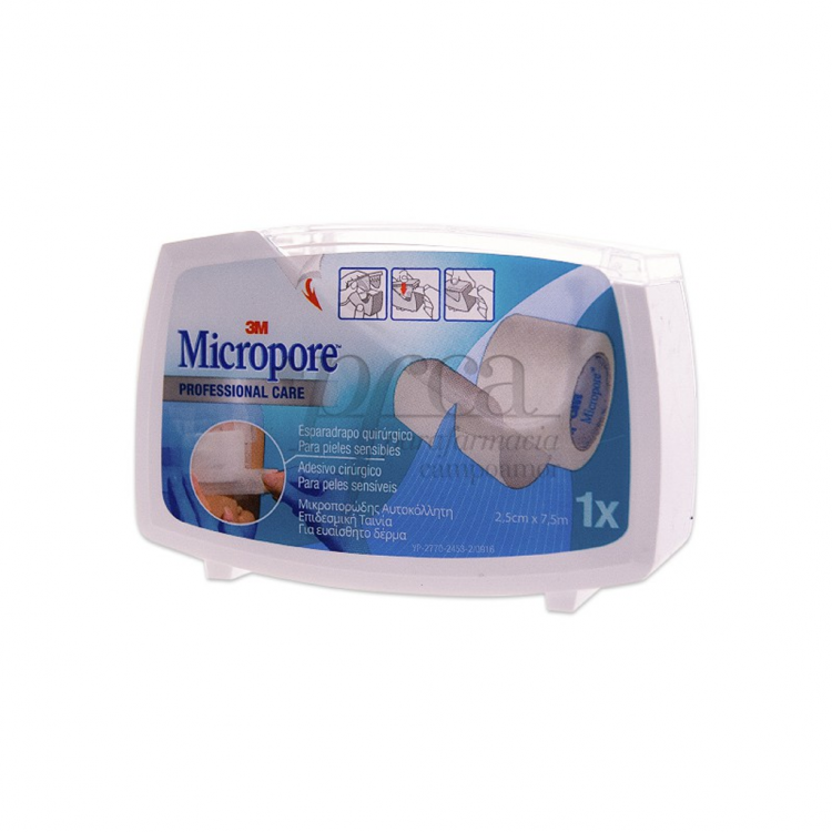 Embalagem com 1 rolo de Micropore Adesivo de 2,5cm de largura e 7,5m de comprimento, em que a própria embalagem serve de dispensador.