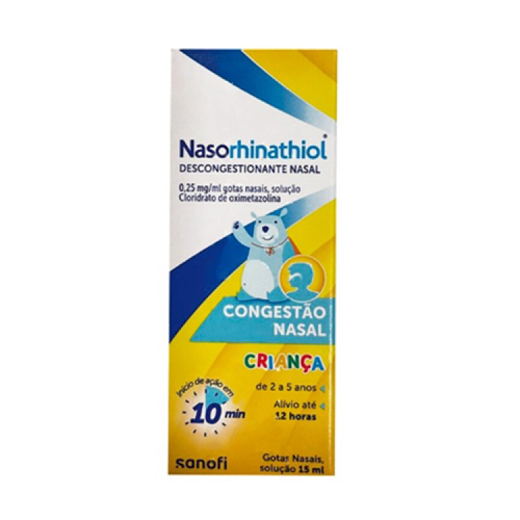 Nasorhinathiol está indicado no alívio da congestão nasal (nariz entupido), em casos de rinorreia (corrimento nasal) e associada a estados gripais e constipações. Contém 0,25mg de Cloridrato de oximetazolina por ml.