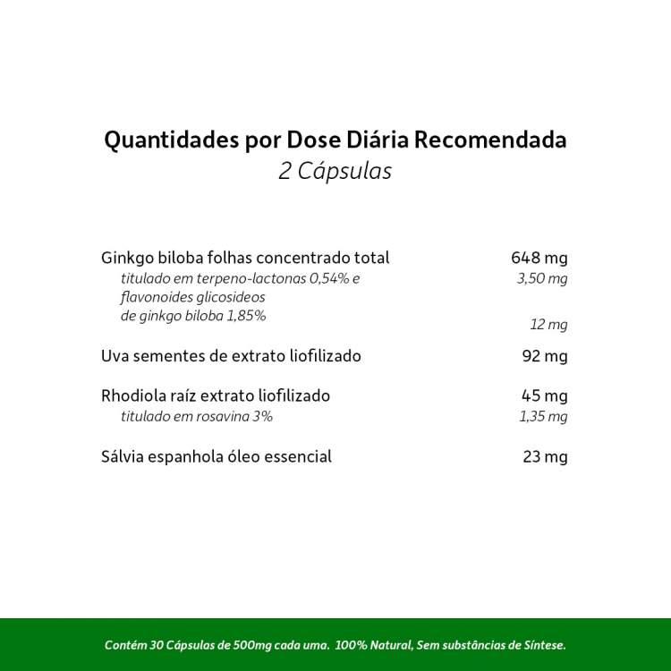Suplemento alimentar indicado para estados de fadiga mental, como por exemplo em períodos de trabalho e estudo intenso. Ajuda a melhorar o desempenho cognitivo, a manter a concentração e a memória. Tem uma ação tónica/adaptogénica que ajuda o organismo a adaptar-se ao stress emocional, ao esforço físico, ajuda a estimular o sistema nervoso e tem um efeito benéfico em caso de fadiga e dor de cabeça induzida. A formulação foi enriquecida com extrato de sementes de Uva que oferece uma defesa contra os radicais livres. Contém Ginkgo Biloba, Rhodiola, sementes de Uva e Sálvia espanhola.