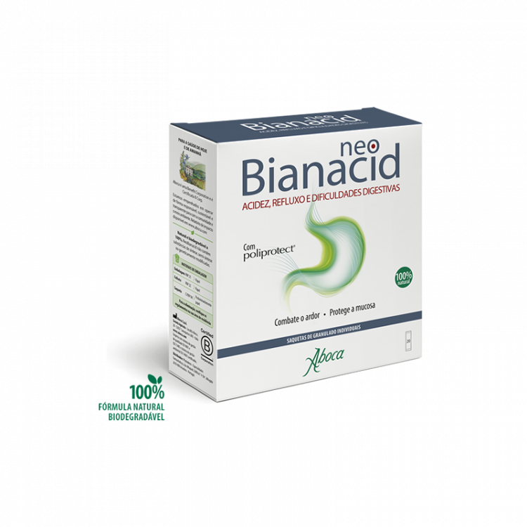 NeoBianacid é um produto à base de complexos moleculares vegetais e minerais, que desenvolve uma ação protetora e, por isso, lenitiva da mucosa gastroesofágica útil para combater rapidamente o ardor, a dor e a sensação de acidez. Está indicado no tratamento dos problemas associados à acidez, como o ardor, a dor, o refluxo gastroesofágico e a gastrite e, também, no tratamento dos sintomas associados a dispepsia (dificuldade de digestão), como o ardor, a sensação de peso e o meteorismo. NeoBianacid pode ser útil como produto de prevenção nas situações que podem induzir irritações da mucosa (toma de medicamentos analgésicos/anti-inflamatórios não esteroides, períodos de stress psicofísico, mudança de estação, alimentação e estilo de vida incorretos). O produto é adequado igualmente para utilização na gravidez, durante a amamentação e nas crianças com mais de 6 anos. NeoBianacid forma na mucosa uma película com efeito barreira, que a protege contra o contacto com os sucos gástricos e as substâncias irritantes. NeoBianacid contém Poliprotect®, um complexo molecular fruto da investigação Aboca com propriedades mucoadesivas específicas. Ajuda ainda a combater a irritação provocada pelos radicais livres, devido às suas propriedades antioxidantes. Tome o conteúdo de uma saqueta, quando necessário, deixando dissolver lentamente na boca.