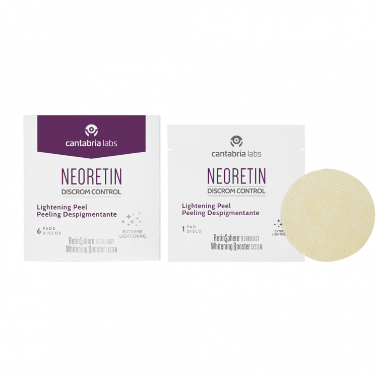 NEORETIN Discrom Control Peeling Despigmentante possui um sistema inovador de peeling de uso doméstico, que potencia a ação de outros produtos despigmentantes. Os seus ativos esfoliantes químicos e enzimáticos favorecem a renovação da pele em 20 minutos. A RetinSphere® Technology estimula a renovação epidérmica e potencia o efeito dos restantes ativos. A sua fórmula não comedogénica apresenta-se impregnada em discos concentrados, compostos por fibras puras que minimizam os riscos alérgicos. Apto para todos os tipos de pele. A sua superfície ligeiramente rugosa favorece o peeling mecânico durante a massagem. Testado sob controlo dermatológico e oftalmológico. COMPOSIÇÃO: RetinSphere® Technology; Ácido shikimico, Ácido glicólico, Ácido cítrico, Ácido salicílico, McZyme-C Complex, Ácido Kójico, Niacinamida, Ácido Elágico, Vitamina C estabilizada.