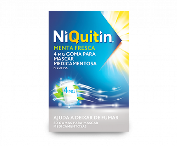 Medicamento não sujeito a receita médica, em forma de gomas para mascar, indicado no tratamento da dependência do tabaco com sabor a menta fresca. Ajuda a aliviar a vontade de fumar, a irritabilidade e mal-estar, para que possa gradualmente parar de fumar. A dosagem das gomas que irá utilizar depender do número de cigarros que fumava antes de iniciar a terapêutica NiQuitin e da fase do tratamento em que está. Cada goma para mascar contém 4mg de Nicotina.