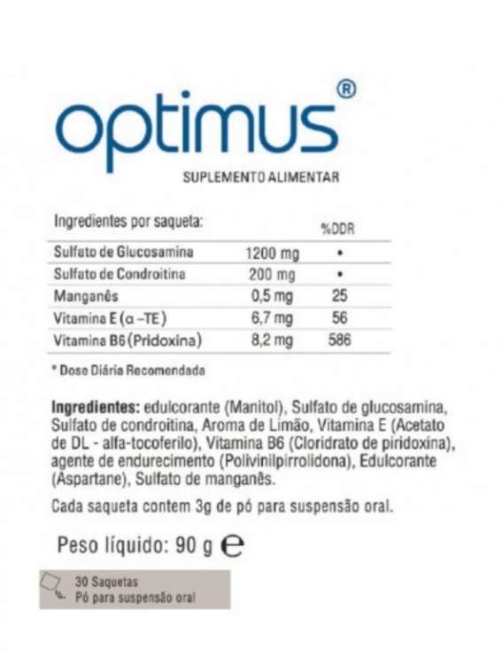 OPTIMUS é um suplemento alimentar que contém uma mistura de sulfato de glucosamina, sulfato de condroitina, manganês, vitamina E e vitamina B6. A sua formulação contribui para a manutenção de ossos normais, para a normal formação de tecidos conjuntivos, para a proteção das células contra oxidações indesejadas e para um normal funcionamento do metabolismo das proteínas e do glicogénio. Recomendado em caso de carência de nutrientes ou indivíduos com grande atividade.