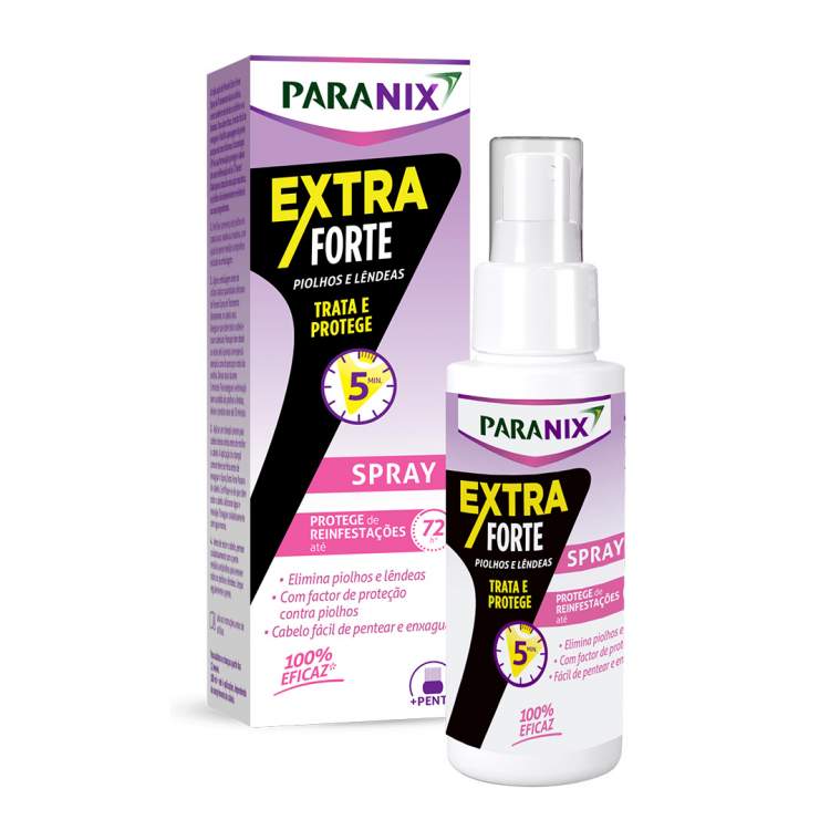 Spray extra forte de tratamento que elimina 100% dos piolhos e lêndeas num só tratamento de 5 minutos e protege o cabelo de reinfestações durante 72h. Spray de tripla ação: Trata sufoca e desidrata piolhos em 5 minutos (para a eliminação das lêndeas, é recomendado um tratamento de 10 minutos); Protege o cabelo graças a uma substância que o torna menos atrativo para piolhos e impede a sua reinfestação até às 72 horas seguintes; Limpa em suavidade, possui uma fórmula sem silicone e sem recorrer a insecticidas. Uma vez que não contém inseticidas, os piolhos não desenvolvem resistência aos seus ingredientes. A sua aplicação é prática: passe o pente metálico pelos fios, de seguida pulverize bem o cabelo e couro cabeludo secos, massajando bem e com especial atenção às áreas do pescoço e atrás das orelhas. Depois aplique um champô para cabelo oleoso, massaje bem e enxague. Para terminar volte a passar o pente metálico para remover os restantes piolhos e lêndeas.