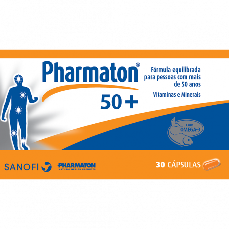 Pharmaton 50+ é um multivitamínico cuja fórmula completa e equilibrada contém vitaminas, minerais essenciais, ácidos gordos ómega 3 (EPA e DHA), e foi especialmente desenvolvida para suprir as necessidades nutricionais específicas do organismo a partir dos 50 anos. À medida que os anos passam, o estilo de vida moderno pode constituir um desafio para o seu organismo. Pharmaton 50+ reúne numa só fórmula ingredientes-chave que o ajudam a manter as sete áreas essenciais do seu organismo a funcionar normalmente: Sistema cardiovascular; Saúde do Sistema Imunitário; Função cerebral; Energia; Visão; Manutenção de Ossos e Cartilagem; Pele, Cabelo e Unhas. Sem glúten lactose ou sacarose.