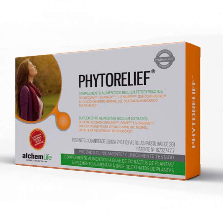 Phytorelief® é um suplemento alimentar formulado com extratos de plantas complexos e exclusivos* de curcuma, gengibre e romã desenvolvidos e registados por Alchem Internacional que ativam a recuperação do equilíbrio. Graças aos seus ingredientes ativos fornecem numerosos benefícios ao nosso organismo, contribuindo para apoiar as defesas do nosso organismo e assim proporcionar um alívio natural contra o resfriado.