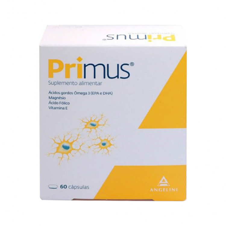 PRIMUS é um suplemento alimentar, sob a forma de cápsulas de gelatina ovais e de cor laranja-escura. Cada cápsula contém uma mistura de óleo de peixe rico em ácidos gordos ómega-3 (DHA e EPA), vitamina E, magnésio e ácido fólico. O EPA e o DHA contribuem para o normal funcionamento do coração. O DHA contribui para a manutenção de uma normal função cerebral. O efeito benéfico é obtido com uma dose diária de 250 mg. A vitamina E contribui para a proteção das células contra as oxidações indesejáveis. O magnésio contribui para a redução do cansaço e da fadiga e para o normal funcionamento do sistema nervoso. O ácido fólico contribui para a síntese normal dos aminoácidos, para o normal metabolismo da homocisteína e para uma normal função psicológica.