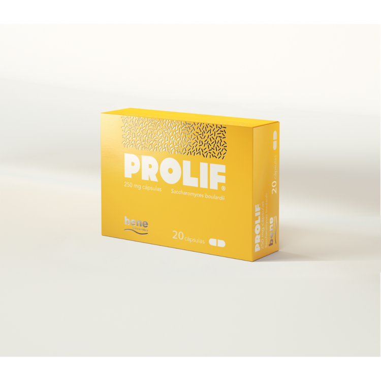 Prolif® 250 mg cápsulas contém 250 mg de liofilizado com Saccharomyces boulardii e está indicado em adultos e crianças com mais de 6 anos para tratamento dos sintomas de diarreia aguda e prevenção da diarreia associada à toma de antibióticos. Está contraindicado em doentes com alergia a leveduras, a Saccharomyces boulardii ou a qualquer outro componente, em doentes com cateter venoso central, imunocomprometidos ou com doença grave devido a um risco de fungemia, ou que estejam internados. É necessária precaução se a diarreia durar mais do que 2 dias, se aparecer sangue nas fezes, se tiver febre, se sentir sede exagerada, secura da língua ou se tiver o sistema imunitário enfraquecido.