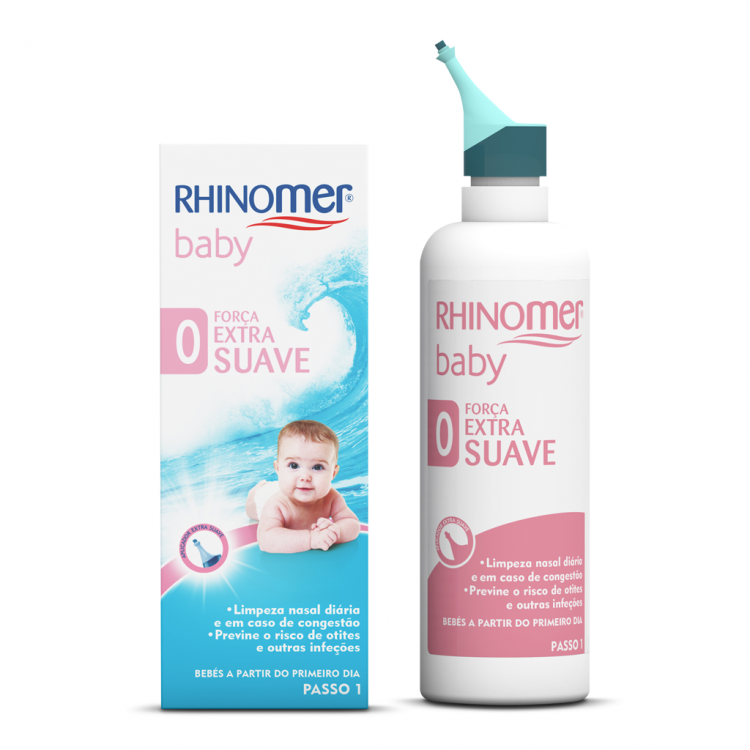 Rhinomer Baby Força Extra Suave é um spray nasal à base de água do mar 100% natural indicado para a higiene nasal dos bebés. Higiene diária e prevenção ativa: limpa e humidifica as fossas nasais do seu bebé, eliminando elementos indesejáveis como pó, alergenos, vírus e bactérias; o seu uso regular protege eficazmente contra constipações e rinofaringites e outras complicações. Casos de excesso de mucosidade e constipações: suaviza o muco, facilitando a sua eliminação ou a utilização de um aspirador nasal - a eliminação das mucosidades previne a ocorrência de complicações como otites, bronquites e outras situações muito frequentes em bebés; ajuda de forma natural em caso de congestão nasal devida a constipações. Humidificação das fossas nasais no caso de secura ambiental. Por se tratar de água do mar natural, Rhinomer pode ser utilizado com a frequência desejada e durante o tempo necessário.