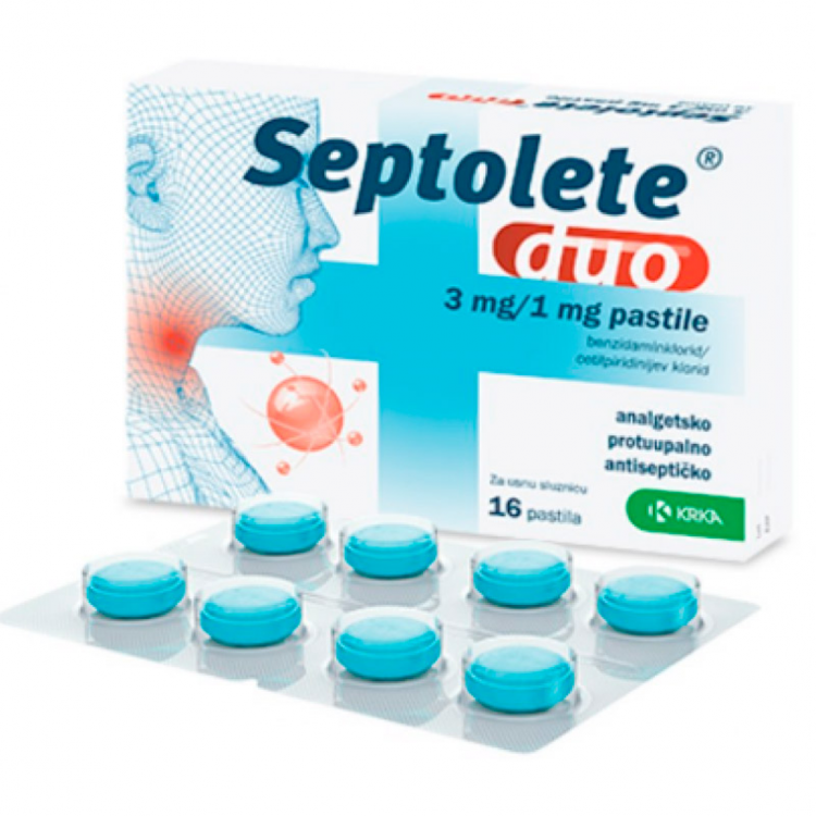 Septolete Duo é um medicamento anti-inflamatório, analgésico e antisséptico que desinfeta a boa e a garganta e reduz a inflamação e a dor de garganta. Medicamento utilizado no tratamento de sintomas de infeções ligeiras na boca e garganta, incluindo gengivite e faringite. Septolete contém 3mg de Cloridrato de benzidamina e 1mg de Cloreto de Cetilpiridínio.