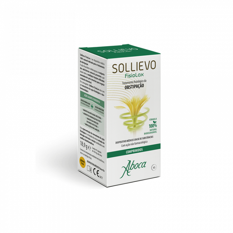 Dispositivo médico 100% natural indicado para o tratamento da obstipação. O conjunto de substâncias presentes, atuam sobre as múltiplas funções utilizadas normalmente pelo intestino, para regular o trânsito intestinal. Por conseguinte, Sollievo FisioLax atua com um mecanismo de ação não-farmacológico. Contribui para aumentar a motilidade intestinal, aumenta a hidratação das fezes, reforça e protege a parede e mucosa intestinal e controla a inflamação, permitindo assim uma ação laxante eficaz e menos agressiva. Recomenda-se tomar entre 1 a 3 comprimidos à noite, quando sentir necessidade, com um abundante copo de água. A dose correta é a mínima suficiente para favorecer o trânsito intestinal fisiológico sem produzir fezes líquidas, por isso pode ser personalizada de acordo com as exigências individuais. O produto é recomendado a partir dos 12 anos de idade.