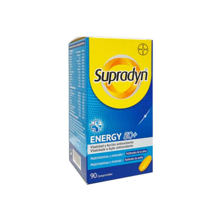 Supradyn Energy 50+ é um multivitamínico formulado para quem se quer manter ativo. Cada comprimido, para além de ser fácil de engolir, contém 12 vitaminas e 9 minerais para ajudar a manter a energia e a vitalidade física. O complexo de Vitaminas B contribui para o normal metabolismo produtor de energia, e a Vitamina C contribui para o normal funcionamento do sistema imunitário. O Zinco e o Selénio estão entre os antioxidantes que protegem as células contra oxidações indesejáveis.