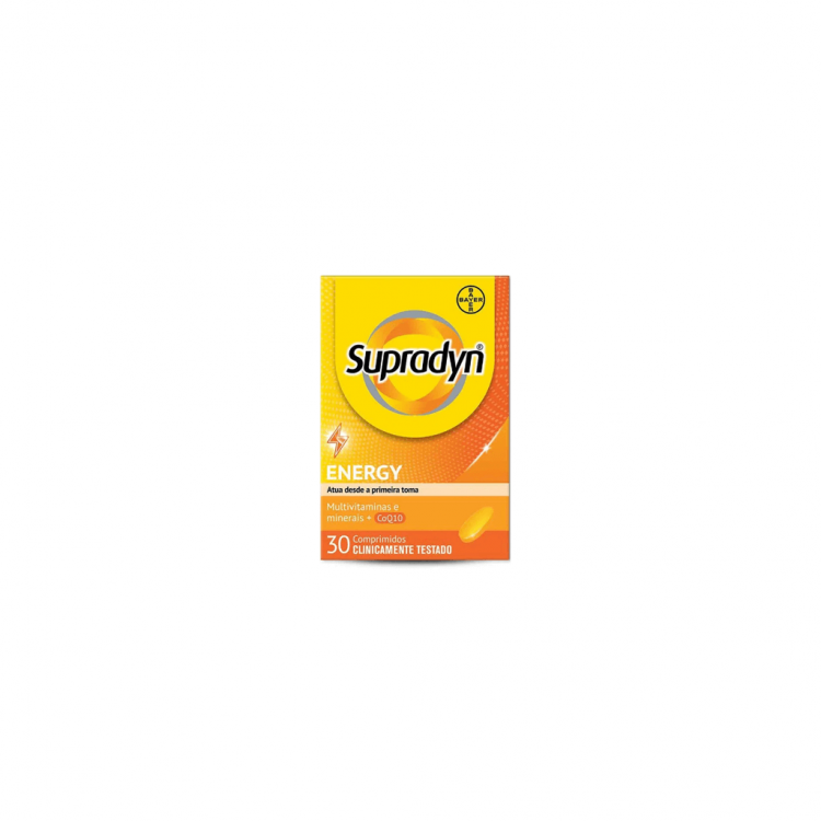 É um suplemento alimentar em comprimidos revestidos de vitaminas e minerais. Os ingredientes de Supradyn® Energy são importantes para a manutenção de várias funções importantes do organismo. Supradyn® Energy contém 13 vitaminas e 10 minerais que possuem diversas funções benéficas para o organismo. Supradyn® Energy contém vitamina C, vitamina D e Zinco, que auxiliam no funcionamento do sistema imune1. Já os micronutrientes como as vitaminas do complexo B contribuem para a produção e utilização de energia pelo organismo.