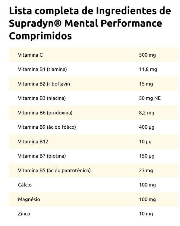 Suplemento alimentar com uma combinação específica de vitaminas do complexo B, vitamina C, e minerais como cálcio, magnésio e zinco, que atuam sinergicamente contribuindo para o rendimento mental e físico e para a redução da fadiga e cansaço. A sua fórmula sem estimulantes artificiais contribui para o normal funcionamento do sistema imunitário, melhora o desempenho cognitivo, concentração, rendimento mental e memória, dá suporte à função psicológica e ajuda a recarregar a energia. Adequado a partir dos 12 anos, para pessoas ativas que pretendam aumentar o seu desempenho mental e ter mais energia. Tomar 1 comprimido por dia, de manhã, com água. Pode ser tomado diariamente durante todo o ano.